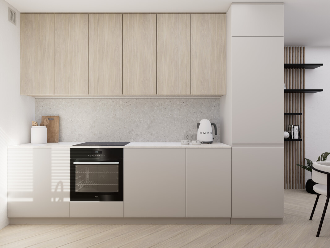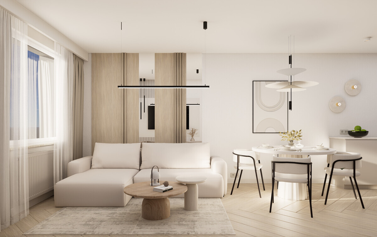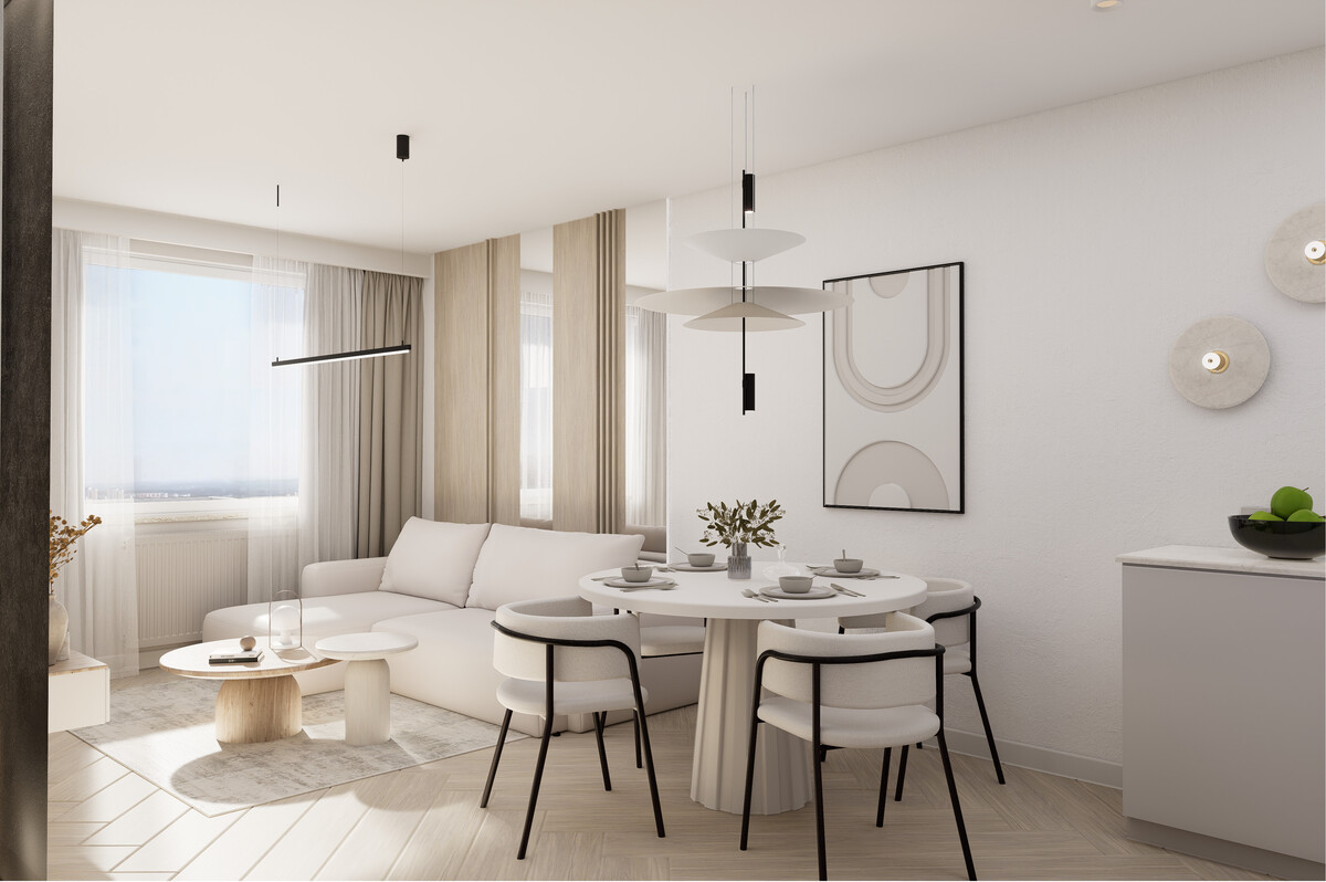Do ogłoszenia dołączone są wizualizacje przedstawiające planowane wykończenie wnętrza, wykonane przez biuro JAVA Architekci – prezentują rzeczywisty standard i koncepcję aranżacyjną mieszkania.