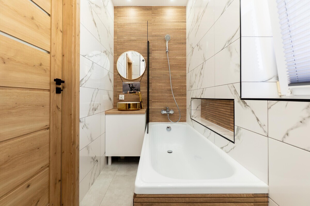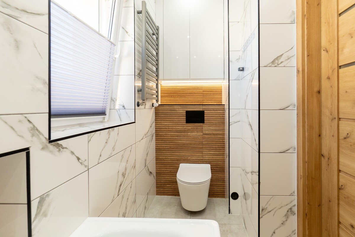 Nowoczesna elegancka łazienka z WC, wyremontowana z dbałością o każdy szczegóły.