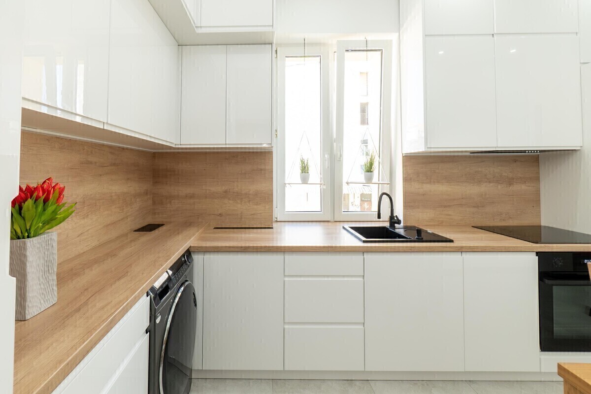 Kuchnia cała w zabudowie, wykonana na zamówienie przez doświadczonego stolarza, wyposażona w wysokiej klasy sprzęty na gwarancji.