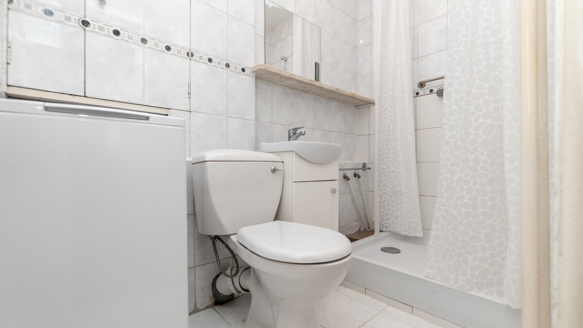 Łazienka wyposażona jest w prysznic, pralkę oraz armaturę, utrzymana w praktycznym i uniwersalnym stylu.