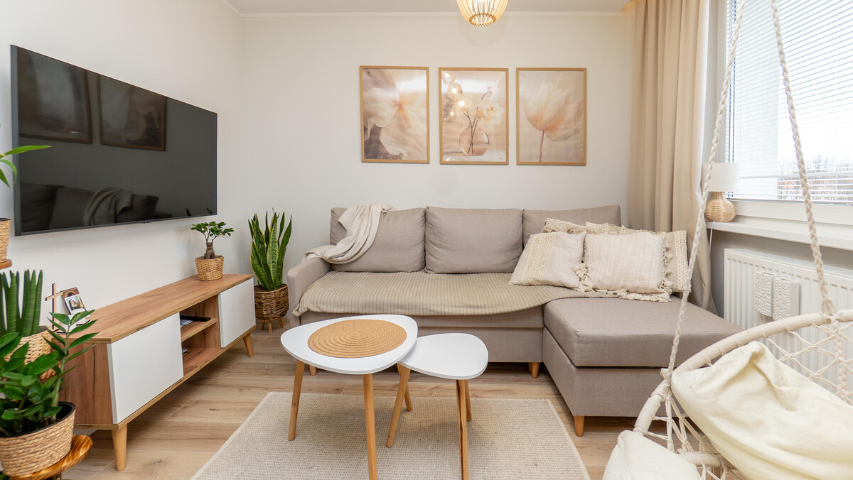 Mieszkanie, w którym światło o poranku delikatnie wypełnia salon, a wieczorem zachodzące słońce otula sypialnię ciepłą barwą.