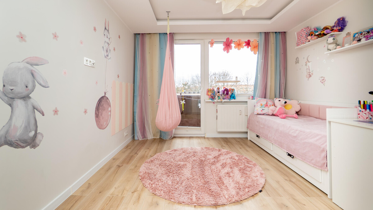 Duża, ustawna sypialnia z pojemną szafą zapewnia komfort przechowywania bez utraty przestrzeni.