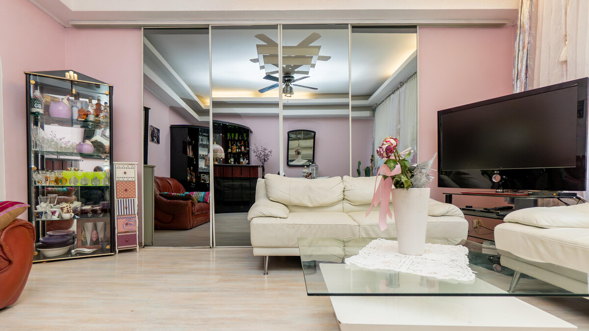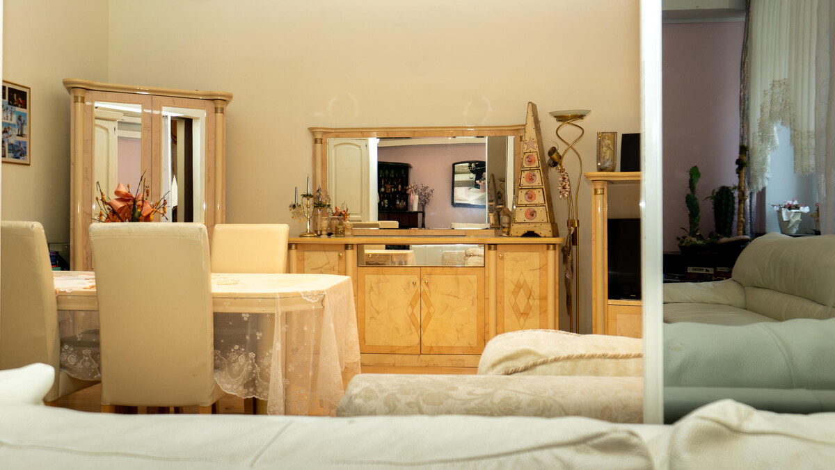 Salon zachwyca dużymi oknami, które wypełniają wnętrze naturalnym światłem. Dodatkowym atutem są lustrzane drzwi przesuwne, dzięki którym w kilka chwil można powiększyć przestrzeń – idealne rozwiązanie na rodzinne spotkania czy przyjęcia w gronie bliskich.