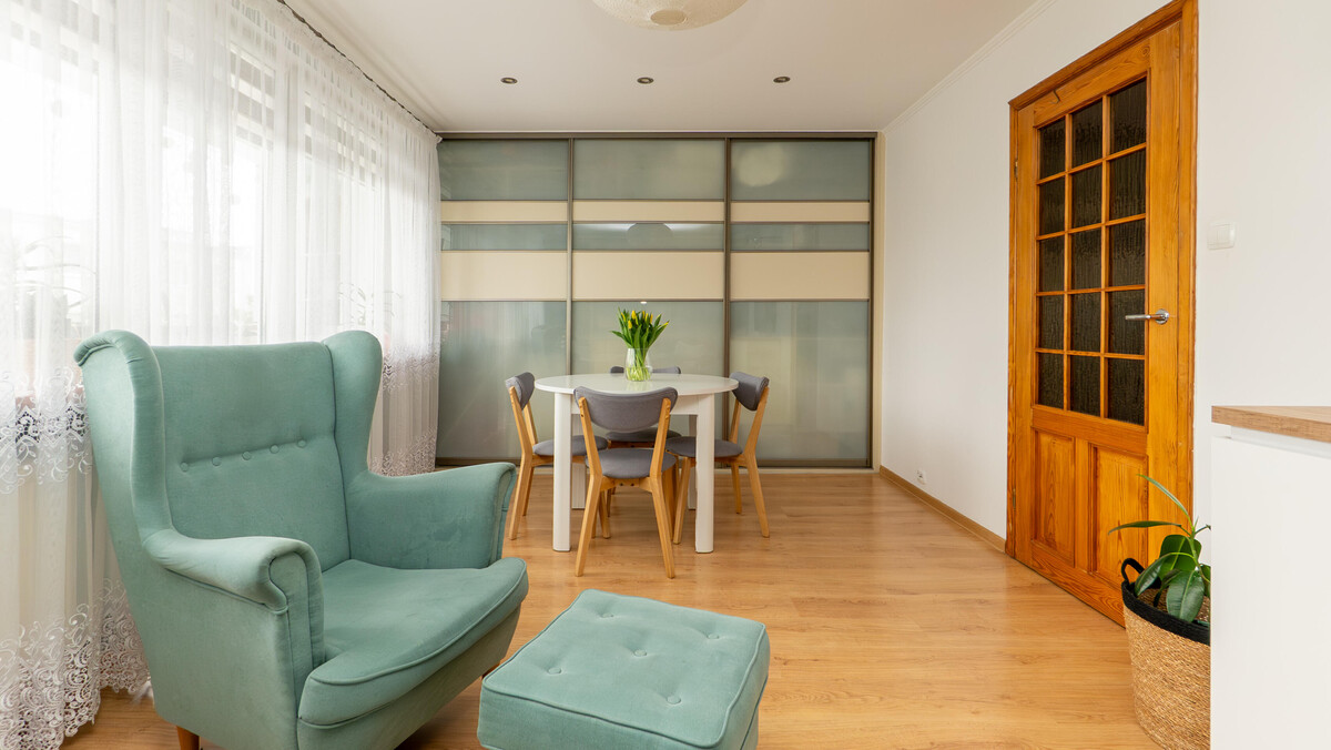 Dwa ustawne pokoje dają swobodę aranżacji – sypialnia, pokój dziecka, domowe biuro lub przestrzeń do pracy zdalnej.