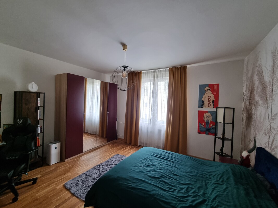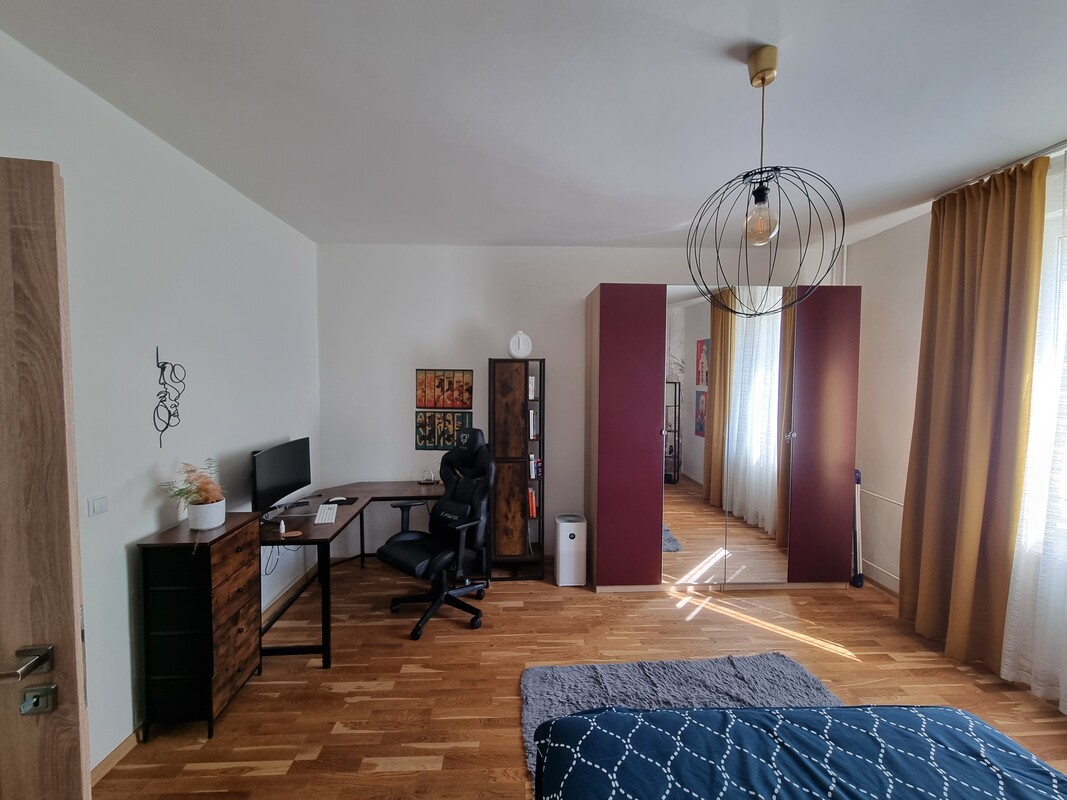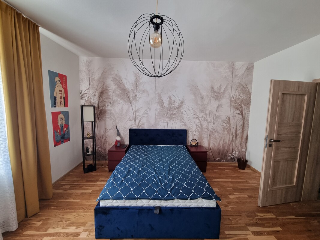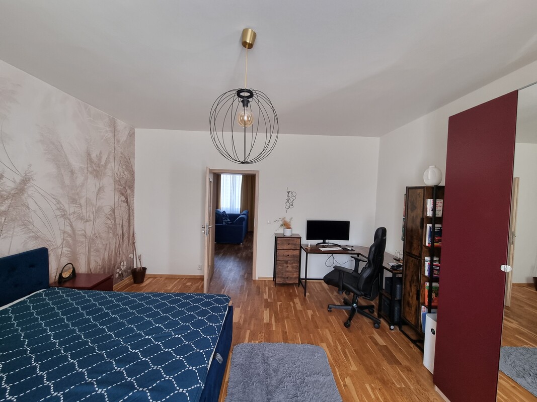 - duża, ustawna sypialnia (ok.20 m2) wraz z widocznymi meblami (duże łózko, 2x duża szafa, duże biurko, szafki nocne, meblo lampka)