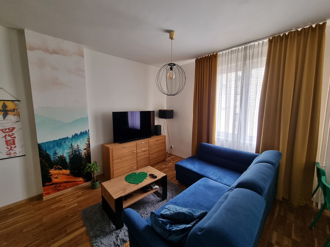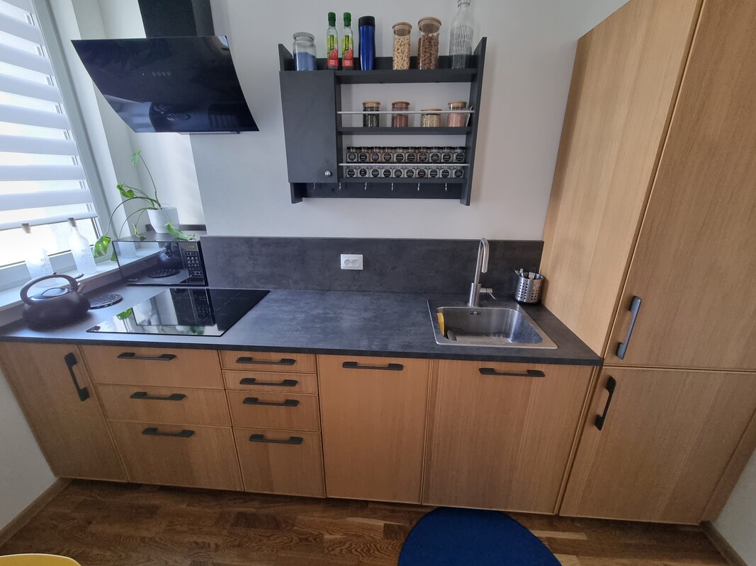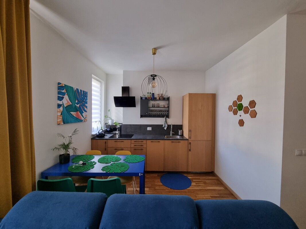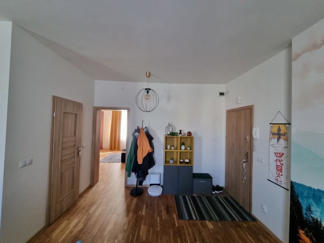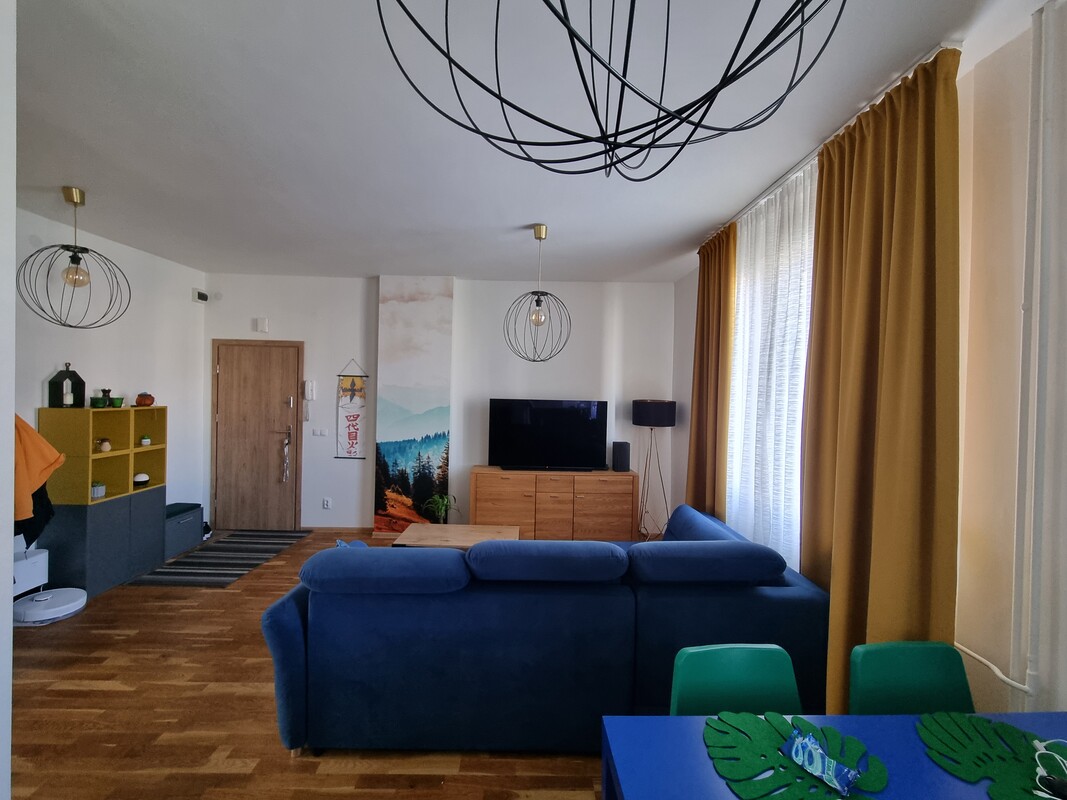 - przestronny salon z aneksem kuchennym (ok.24 m2) wraz z widocznymi meblami i sprzętem AGD (sofa, stolik, komoda, lampa, TV OLED 55 cali, odkurzacz robot, lodówka, zmywarka, płyta Indukcyjna, mikrofalówka) - kuchnię można sobie całkowicie zabudować do góry