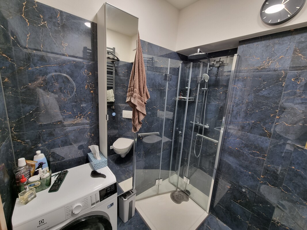 - wygodna łazienka (ok.4 m2) wraz z widocznymi meblami i sprzętem AGD (szafka, szafka pod zlewem oraz pralka)
