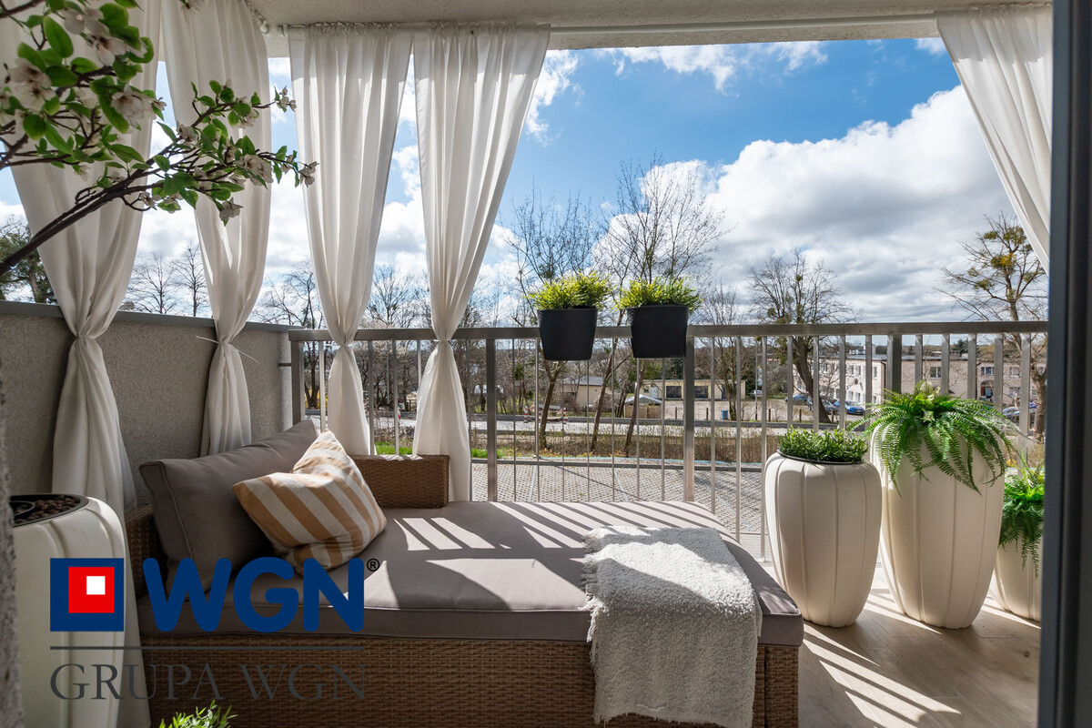 Z salonu mamy możliwość wyjścia na duży balkon o powierzchni 15,79m2, z którego rozpościera się piękny widok na tereny zielone w kierunku ulicy Druskiej. Taras to idealne miejsce na meble ogrodowe, spędzanie na nim wolnego czasu wraz z rodziną. Łazienka z wc, w której wykonano szafkę pod umywalkę i słupek w miejscu gdzie możemy umiejscowić pralkę i suszarkę. W łazience całość dopełnia wanna z parawanem. Klimatu nadają oprawy świetlne, lustra oraz duże kafle z elementami złota.
