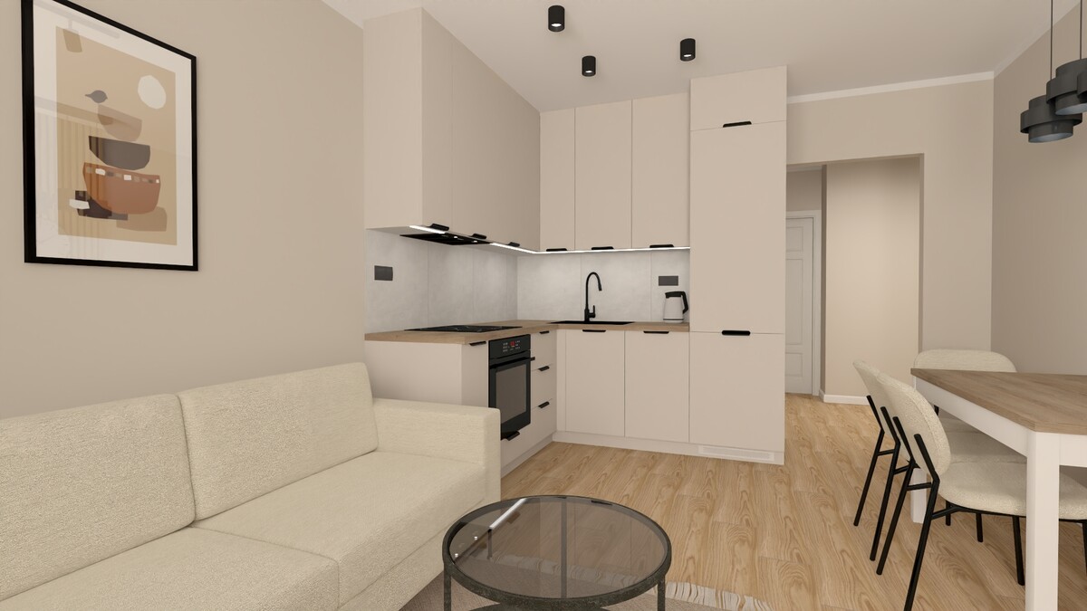 Duży pokój będzie przygotowany wraz z aneksem kuchennym, który zostanie przygotowany przez stolarza zgodnie z projektem według indywidualnego zamówienia.