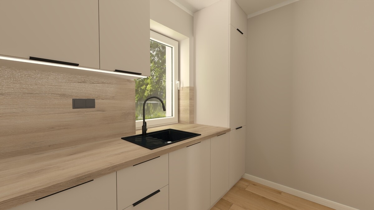 · oddzielnej kuchni z przygotowaną na wymiar przez stolarza zabudową kuchenną, rozplanowaną tak aby blat roboczy spełnił oczekiwania każdego amatora kulinarnego, a ilość szafek do przechowywania była wystarczająca.