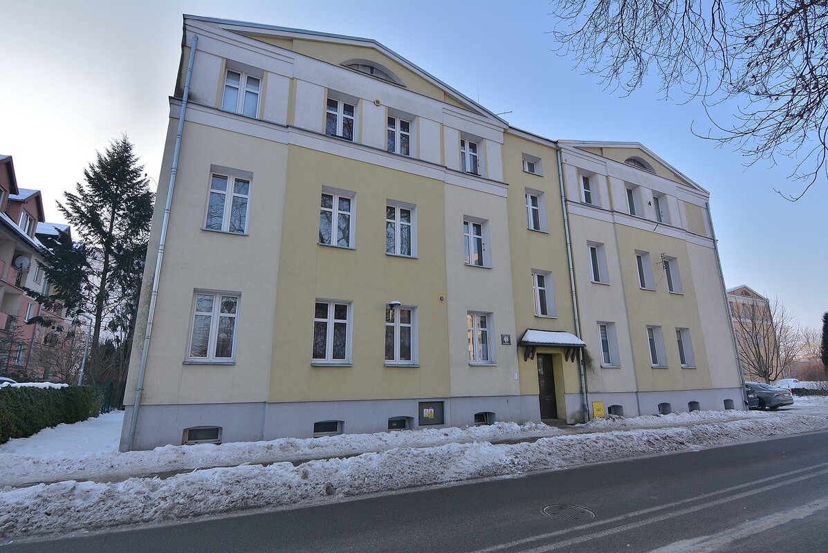 Dwupiętrowa kamienica z 1942 roku z nową elewacją po termomodernizacji i nowym dachem. Przestronne klatki schodowe. Za budynkiem znajdują się ogródki. Parkowanie samochodów możliwe obok budynku. Wejście do budynku zabezpieczone domofonem.