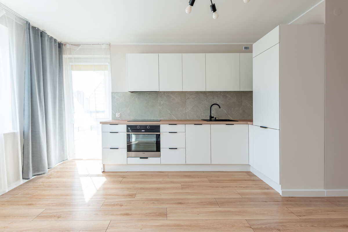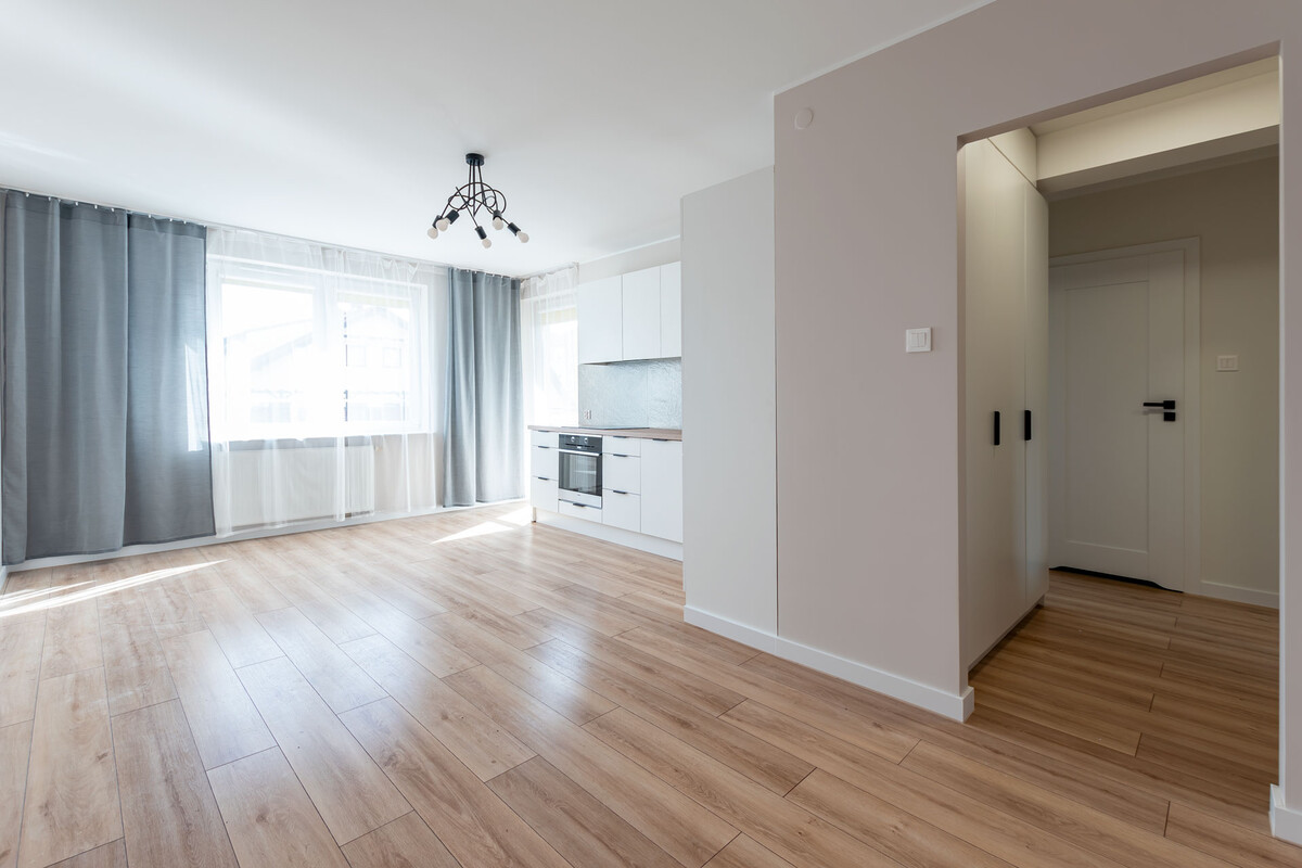 - przestronnego salonu z aneksem kuchennym, z wyjściem na balkon,