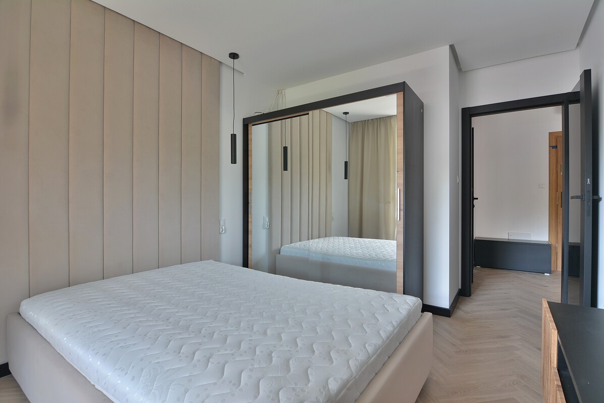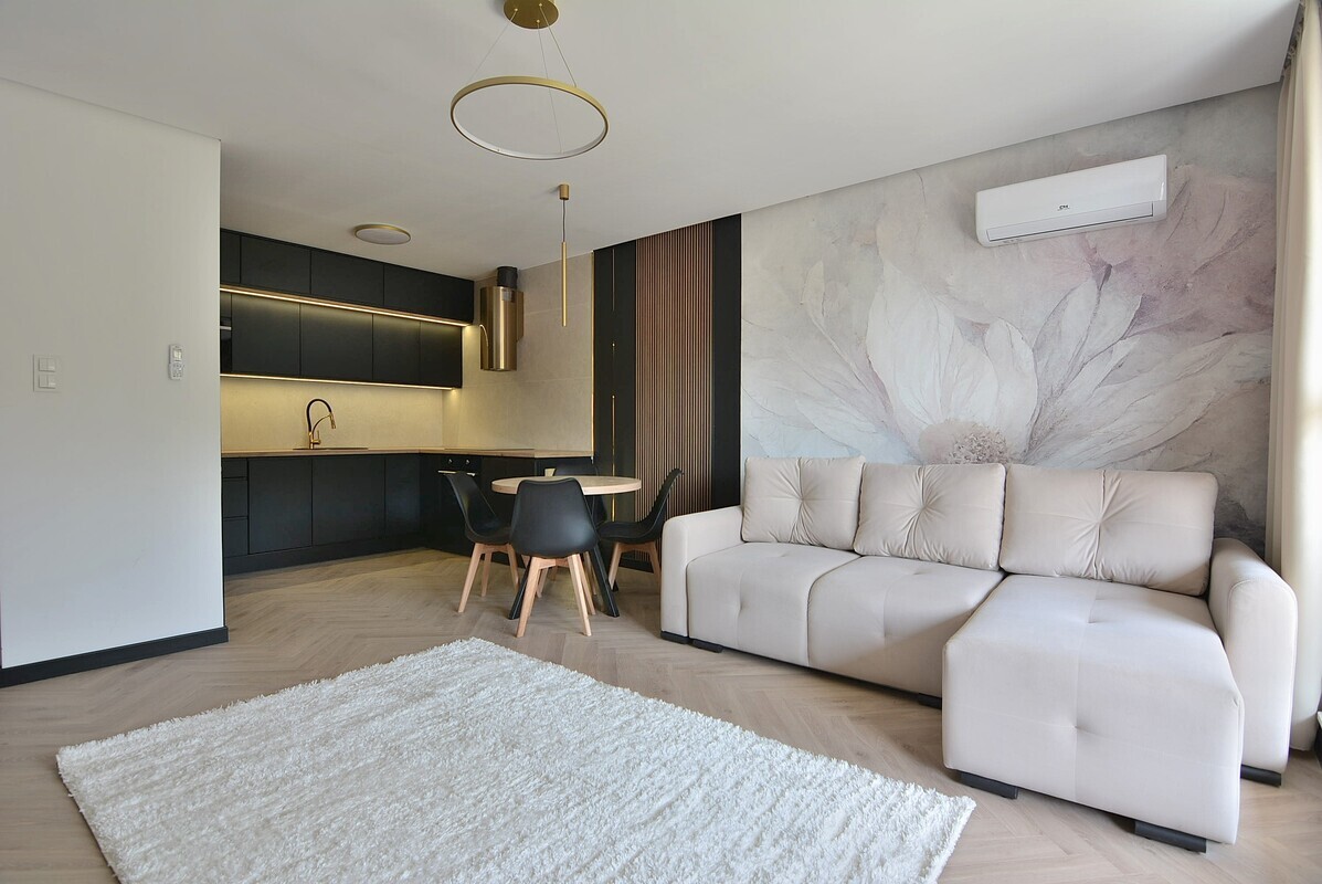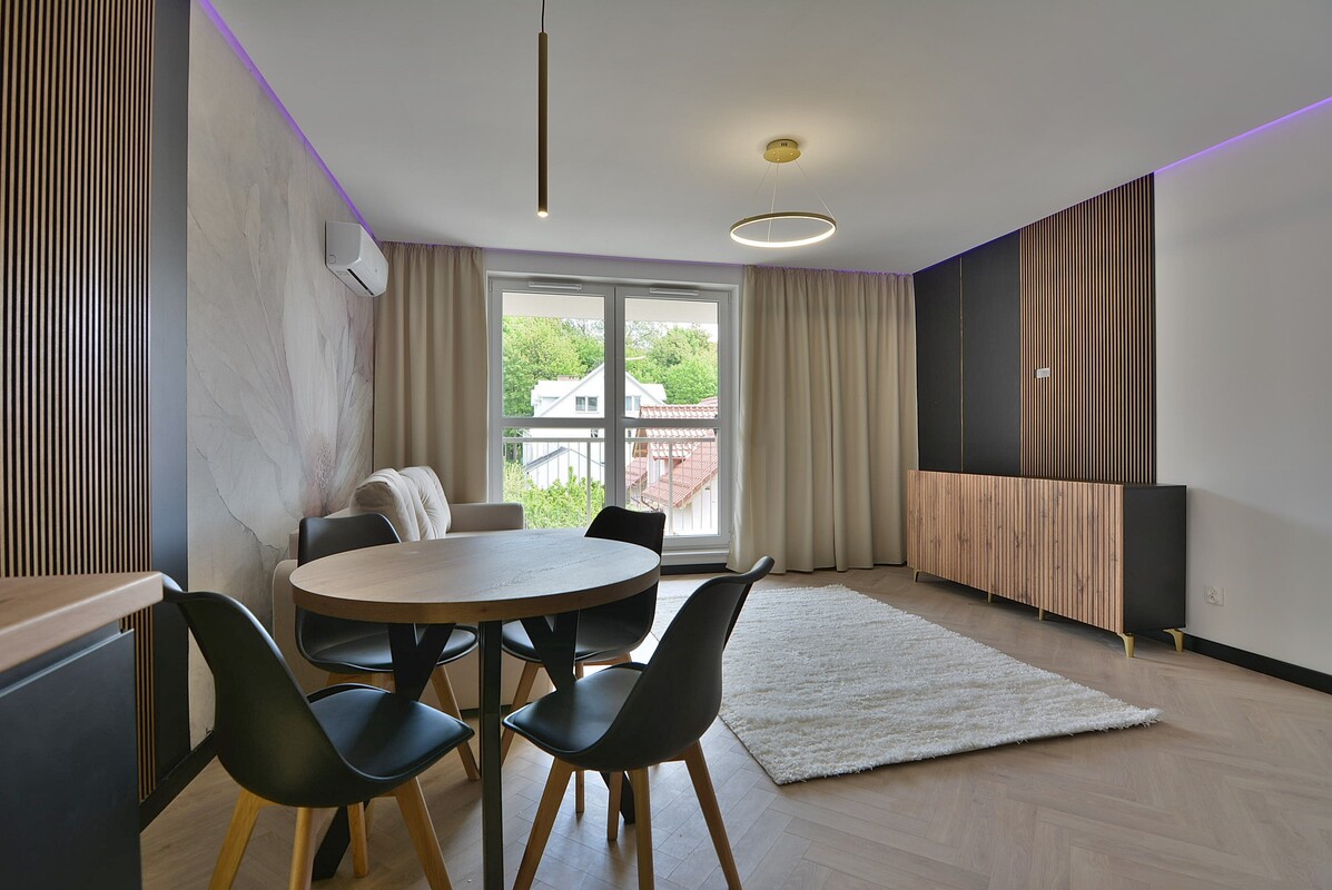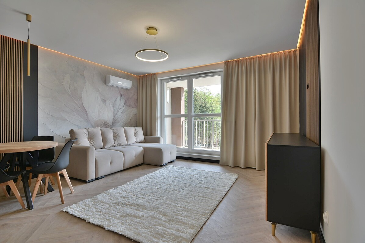 Komfortowe mieszkanie dla wymagającego klienta o powierzchni 45 m2 , składające się z dużego salonu z klimatyzacją, wyposażonego w nowoczesny aneks kuchenny, w którym mamy także oprócz strefy jadalnianej strefę wypoczynkową z nową narożną kanapą, mniejszego pokoju pełniącego funkcję sypialni wyposażonej w pojemną szafę w zabudowie, przedpokoju oraz łazienki wraz z WC. Obydwa pokoje posiadają wyjścia na bardzo duży balkon, zastosowano w nich ciekawe rozwiązania oświetleniowe. Aneks kuchenny wyposażony w nowy, nieużywany sprzęt AGD, w którego skład wchodzi piekarnik z płytą indukcyjną i okapem, lodówka, zmywarka, W łazience nowa pralka i duży prysznic z deszczownicą. Wszystkie media z miasta. Miejsca parkingowe ogólnodostępne. Do mieszkania przynależy komórka lokatorska. Mieszkanie do wynajęcia od 1 stycznia 2026 r dla singla lub pary, ceniących sobie komfort, ciszę i spokój, a zarazem bliskość infrastruktury miejskiej.
