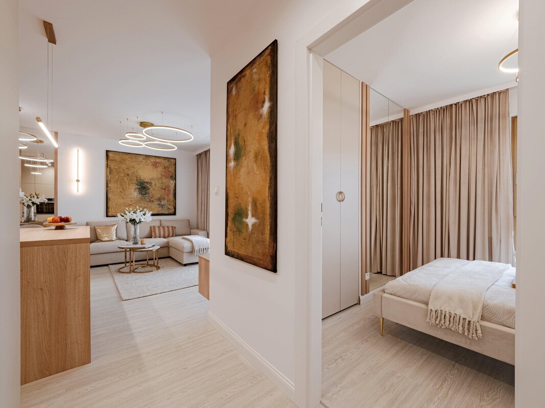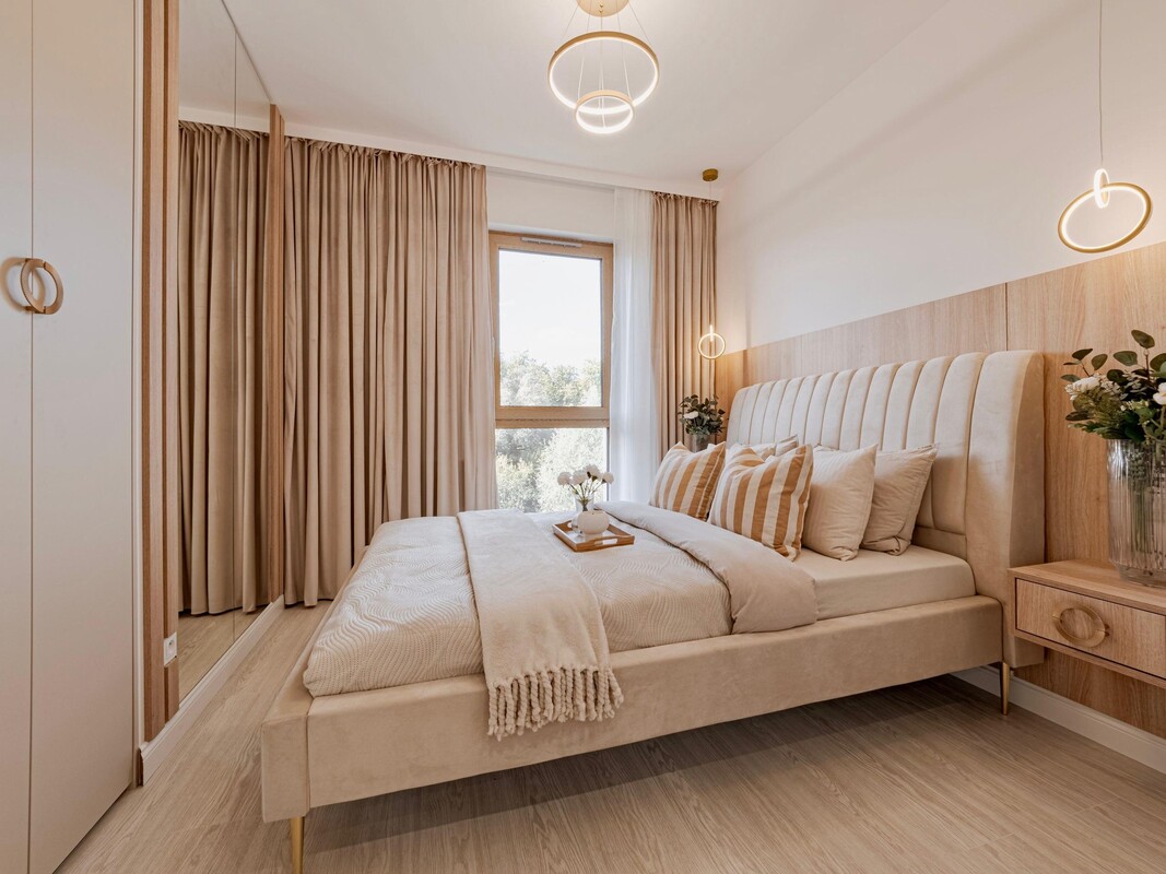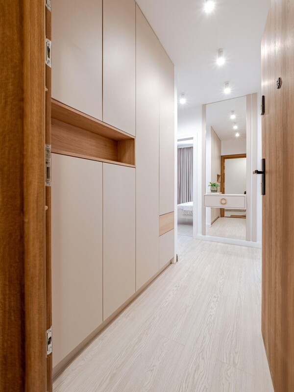 Mieszkanie dodatkowo składa się z dwóch sypialni o powierzchni 9 i 11,5m2. Dodatkowo w mieszkaniu znajduje się łazienka z wc. W łazience wanna z parawanem. To bardzo dobra opcja dla osób, które jednak wolą prysznic od wanny. Tutaj znajdziemy także miejsce na pralkę i suszarkę. Wszystko także przygotowane w jasnych i nowoczesnych kolorach, tak aby czuć się tutaj komfortowo. W przedpokoju stylowa konsola, szafa na wymiar oraz duże lustro. W pokojach oraz przedpokoju położono jasny panel, idealnie współgrający z innymi elementami i kolorami w mieszkaniu. Sypialnia dodatkowo posiada dużą, pojemną i przestronną szafę.
