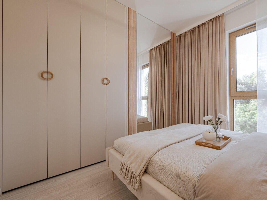 Mieszkanie dodatkowo składa się z dwóch sypialni o powierzchni 9 i 11,5m2. Dodatkowo w mieszkaniu znajduje się łazienka z wc. W łazience wanna z parawanem. To bardzo dobra opcja dla osób, które jednak wolą prysznic od wanny. Tutaj znajdziemy także miejsce na pralkę i suszarkę. Wszystko także przygotowane w jasnych i nowoczesnych kolorach, tak aby czuć się tutaj komfortowo. W przedpokoju stylowa konsola, szafa na wymiar oraz duże lustro. W pokojach oraz przedpokoju położono jasny panel, idealnie współgrający z innymi elementami i kolorami w mieszkaniu. Sypialnia dodatkowo posiada dużą, pojemną i przestronną szafę.