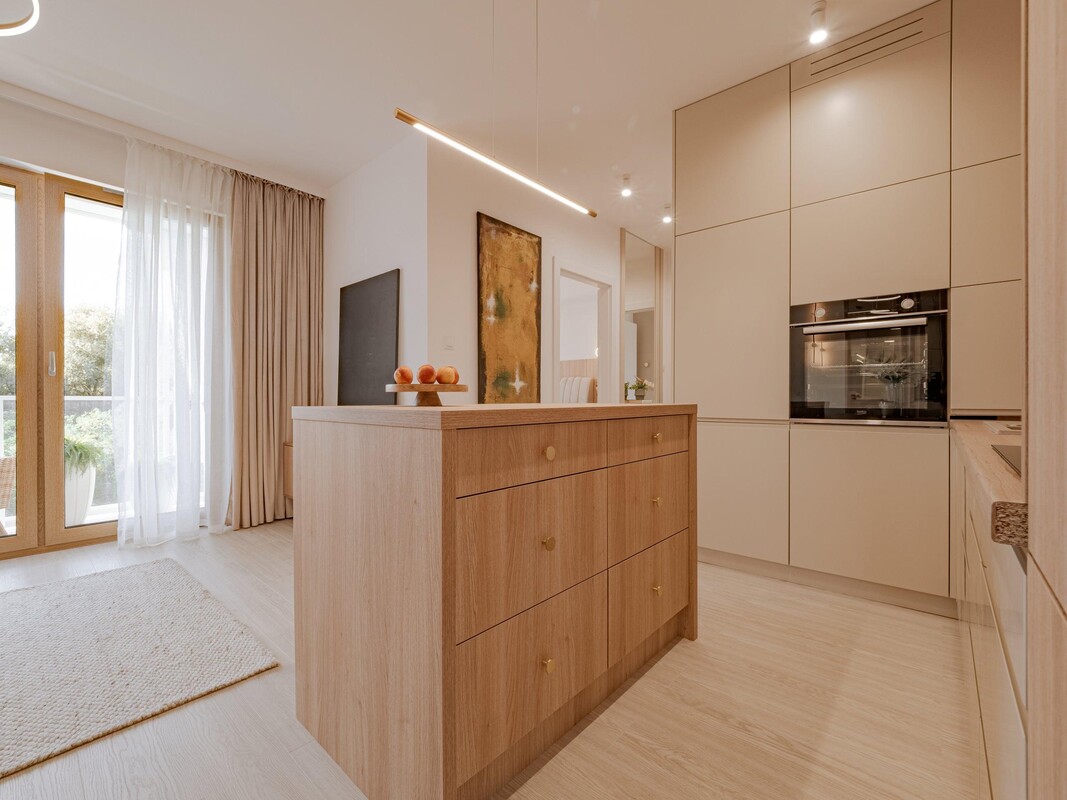 Przestronne mieszkanie o powierzchnie 54,91 m2 położone na 4 piętrze, składające się z salonu z aneksem kuchennym i wyjściem na balkon o powierzchni 24,83m2. Salon z aneksem kuchennym, jasny, z dużym balkonowym oknem, z pięknymi oprawami świetlnymi. Stylowe meble kuchenne w kolorze kaszmir i dąb. Meble kuchenne w zabudowie pełnej, dzięki której posiadamy dużo miejsca do przechowywania. Dodatkowo duży blat roboczy, a nad nim dodatkowe szafki. Goście którzy nas odwiedzą w nowym mieszkaniu zwrócą uwagę z pewnością na wyspę kuchenną. Kuchnia jest wyposażona we wszystkie sprzęty agd. Piękna i komfortu mieszkaniu nadają lustra i lamele, umieszczone na ścianie w salonie, które optycznie powiększają nam pomieszczenie. Tutaj jest jasno, przytulnie, czuć dobrą energię.