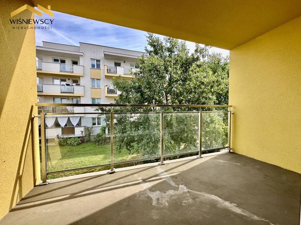 Z salonu mamy wyjście na obszerny balkon z widokiem na zieleń.