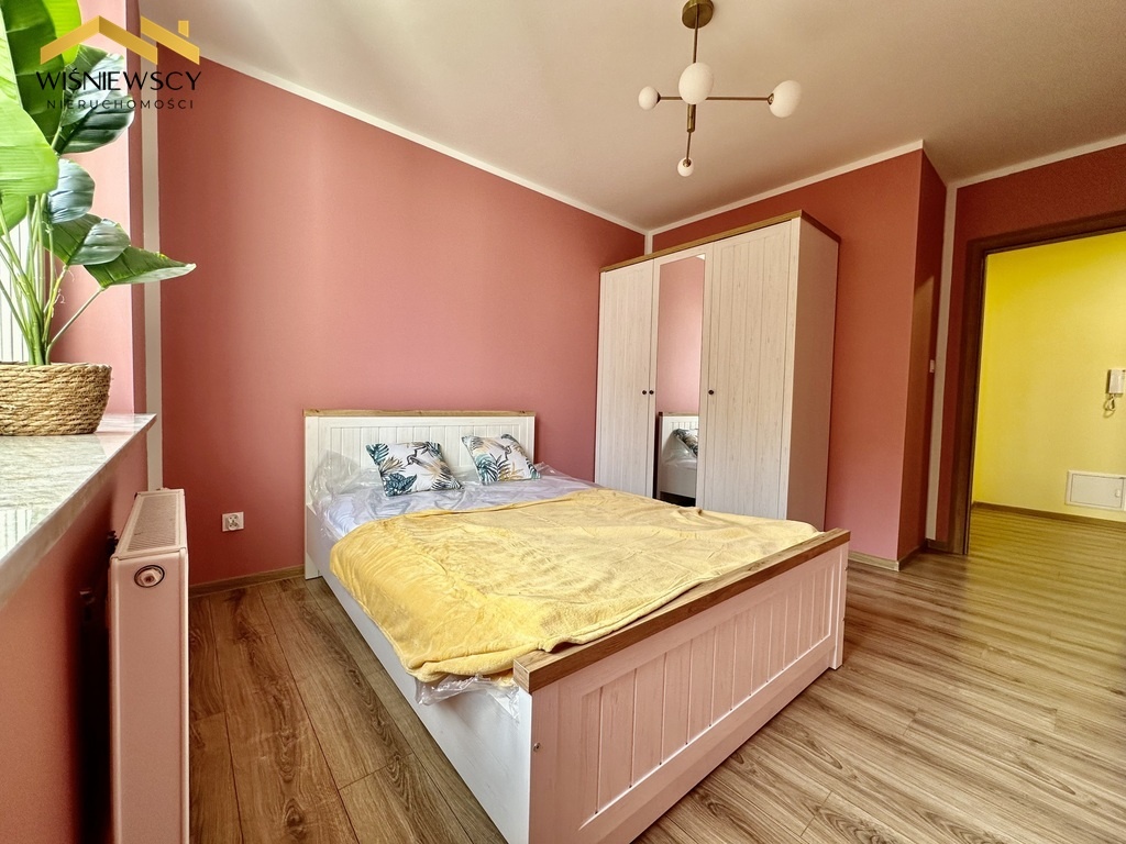 -sypialnia z dużym łóżkiem oraz obszerną szafą