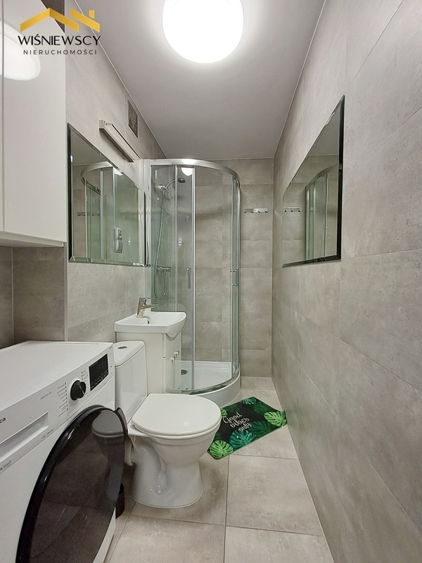 Lokal o powierzchni 36 m² znajduje się na 1. piętrze i składa się z dwóch pokoi, kuchni, łazienki z WC oraz przedpokoju. Z większego pokoju prowadzi wyjście na balkon. Mieszkanie jest w pełni umeblowane – wyposażone w pralkę, lodówkę, zmywarkę i telewizor. W przedpokoju znajduje się szafa w zabudowie. Do dyspozycji najemcy prywatny parking za szlabanem. Idealna propozycja dla pary lub singla. Ogrzewanie i ciepła woda z sieci miejskiej.