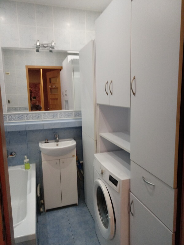 Na mieszkanie składają się dwa pokoje częściowo umeblowane, kuchnia z pełnym wyposażeniem AGD, łazienka z wanną i pralką, przedpokój z dużą wbudowaną szafą oraz oszklona loggia. Do mieszkania należy również piwnica.