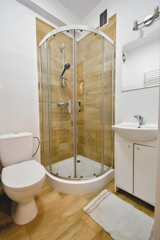 - Łazienka: kabina prysznicowa, WC, lustro, szafka z umywalką