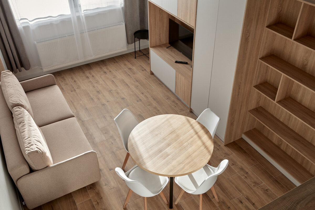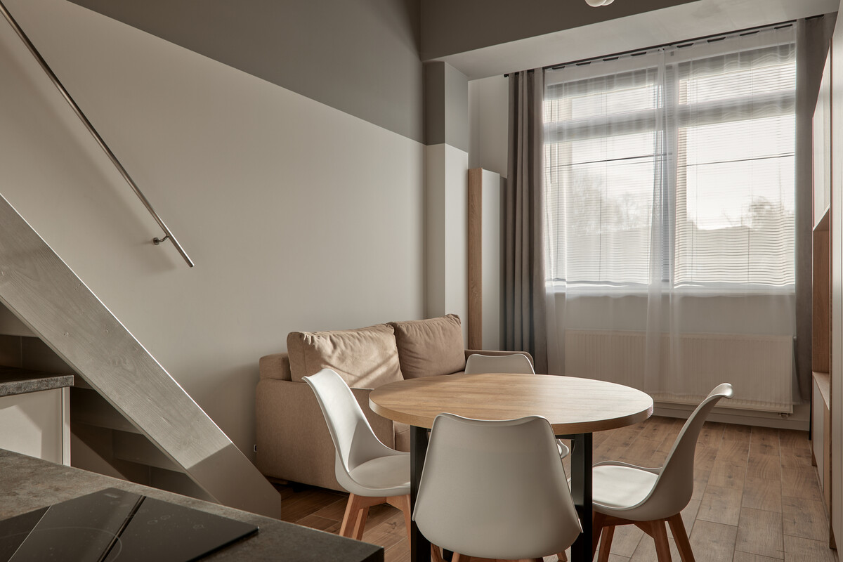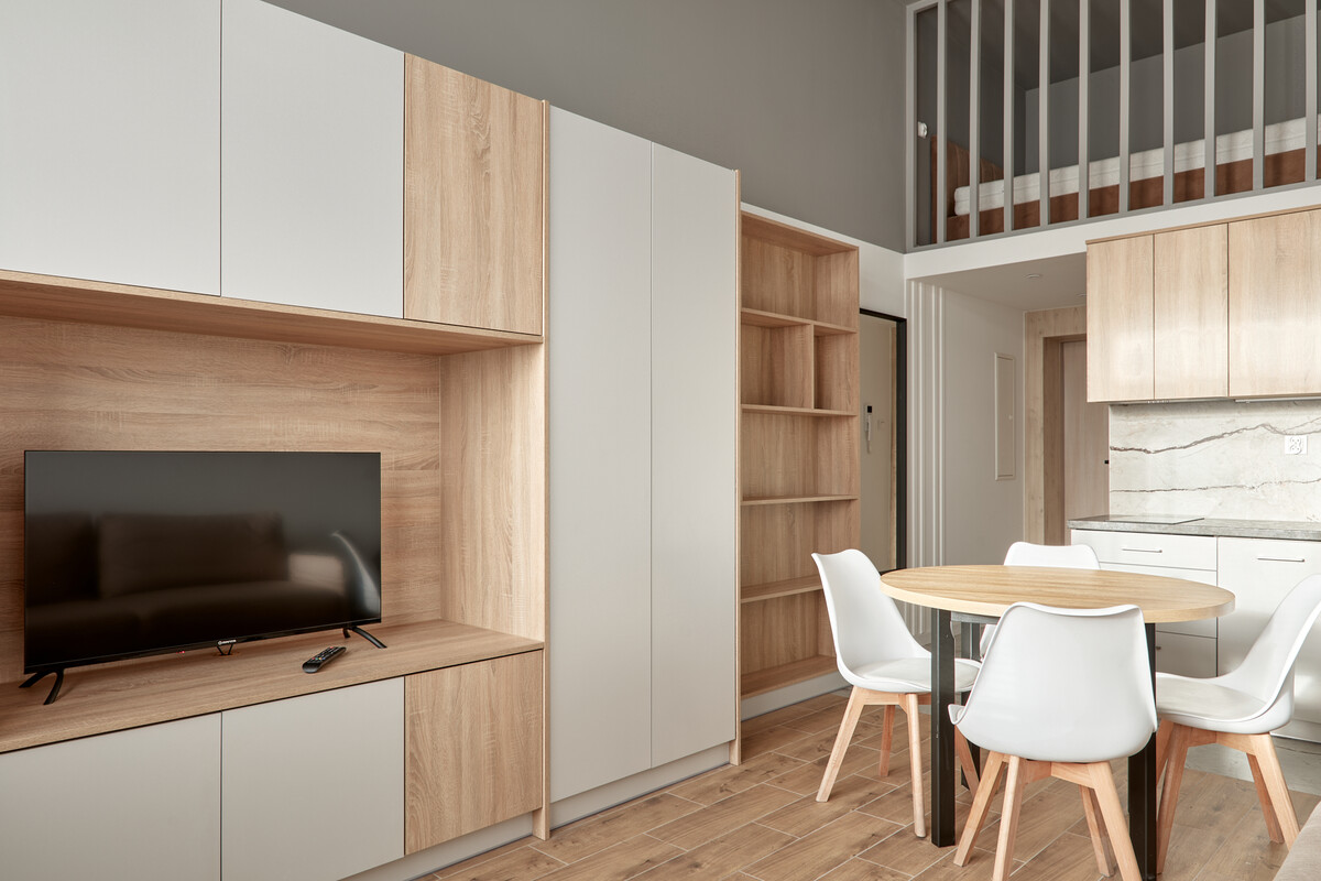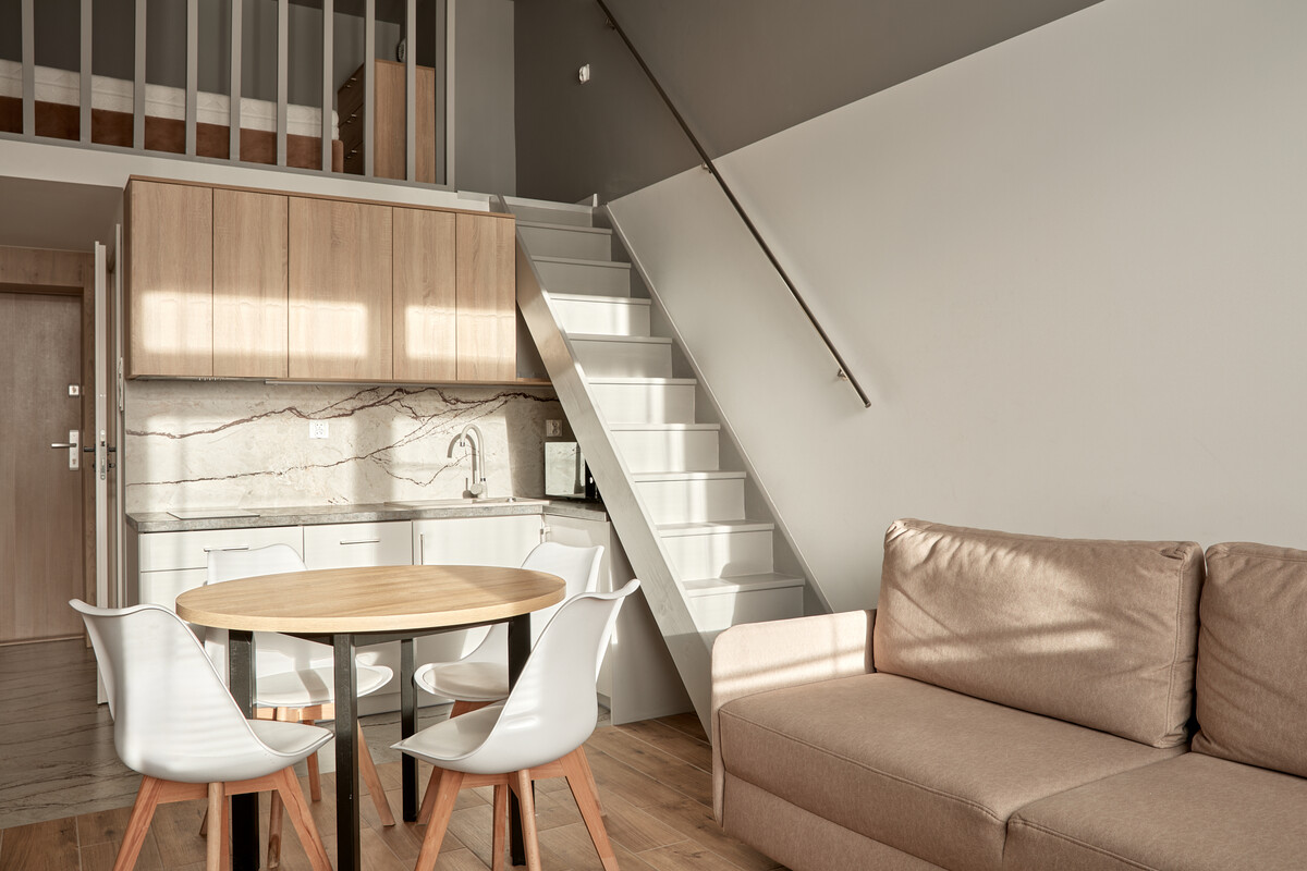 - Układ: Salon z aneksem kuchennym, antresola z sypialnią, łazienka – wszystko świeżo wykończone