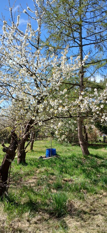 Drzewka owocowe; jabłonie, grusza, śliwka, czereśnie (dwa gatunki) oraz drzewa iglaste-sosny.