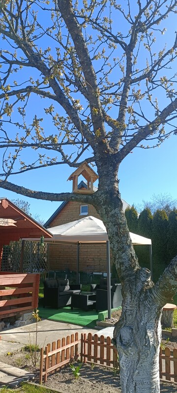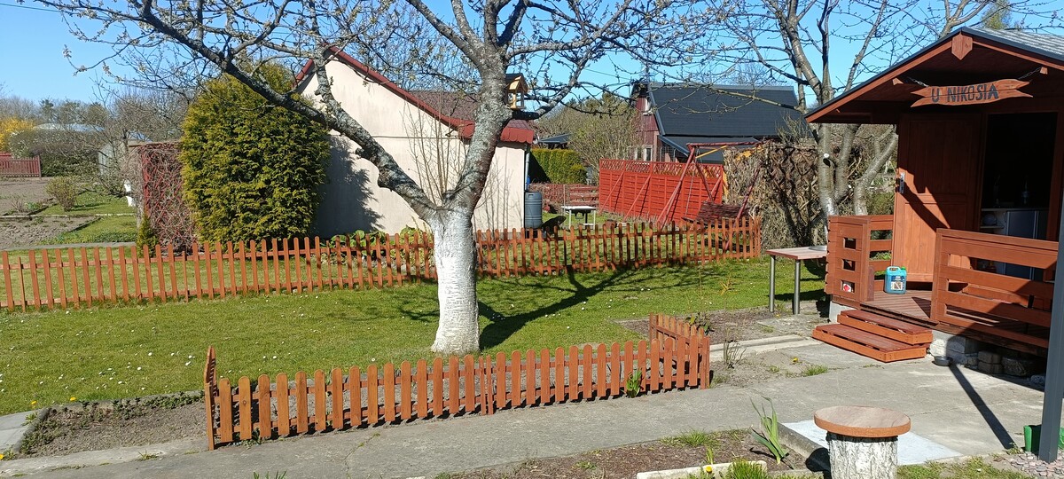- zadbana, ogrodzona, z licznymi nasadzeniami (drzewa owocowe, krzewy, kwiaty),