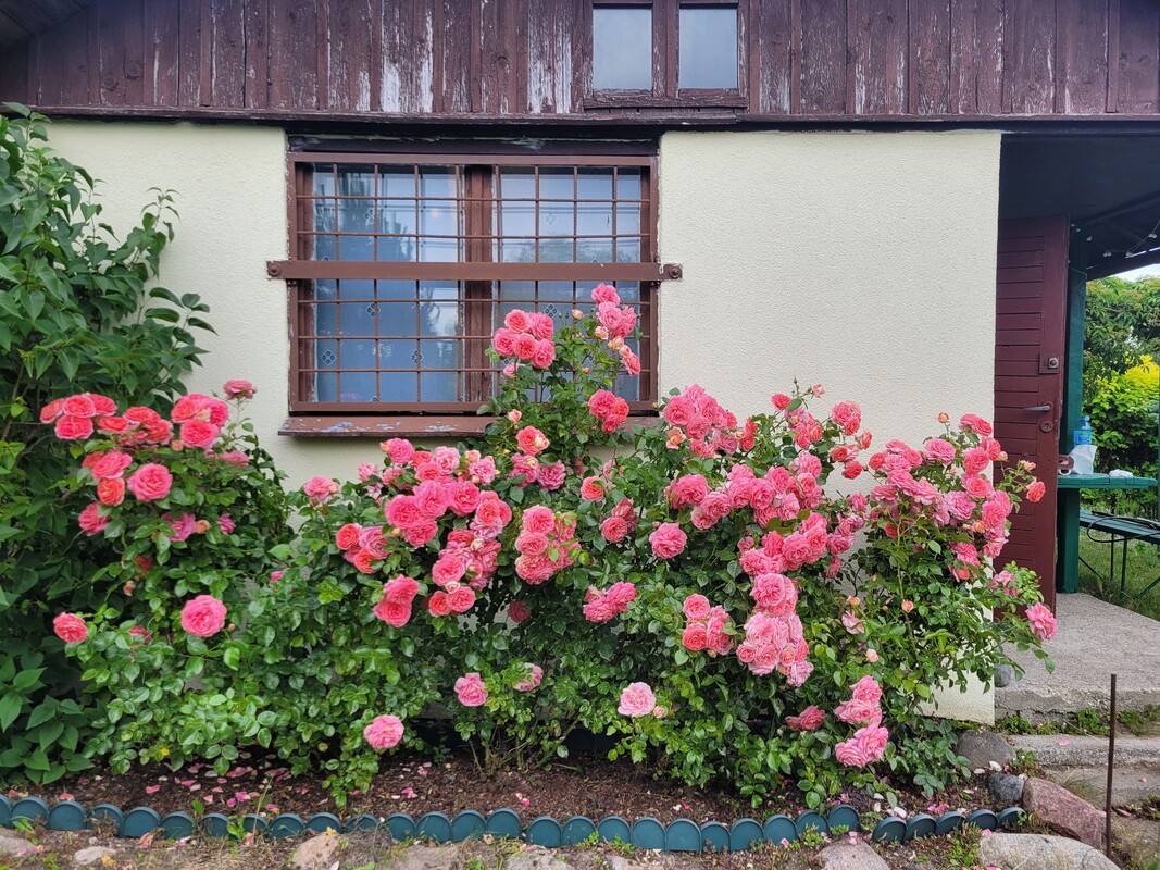 Działka odgrodzona od sąsiadów dużymi nasadzeniami: tujami, jałowcami oraz krzewami ozdobnymi. Za altanką znajdują się trzy krzewy borówki amerykańskiej. Z przodu altanki oraz wzdłuż chodnika znajdują się kilkuletnie długo kwitnące róże.