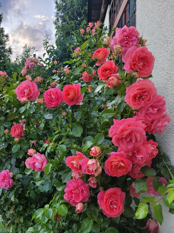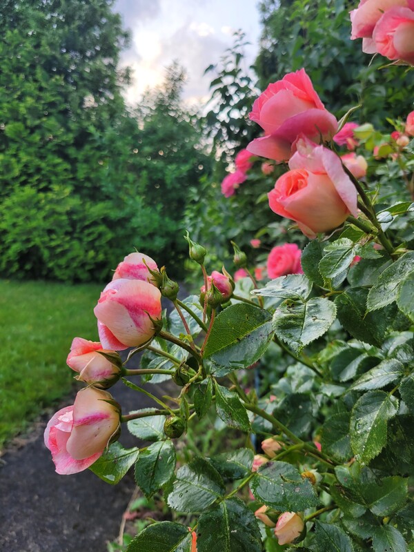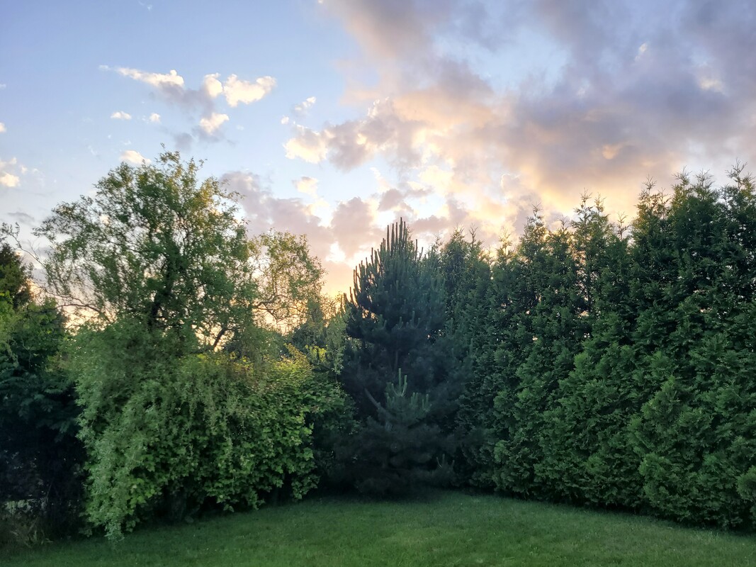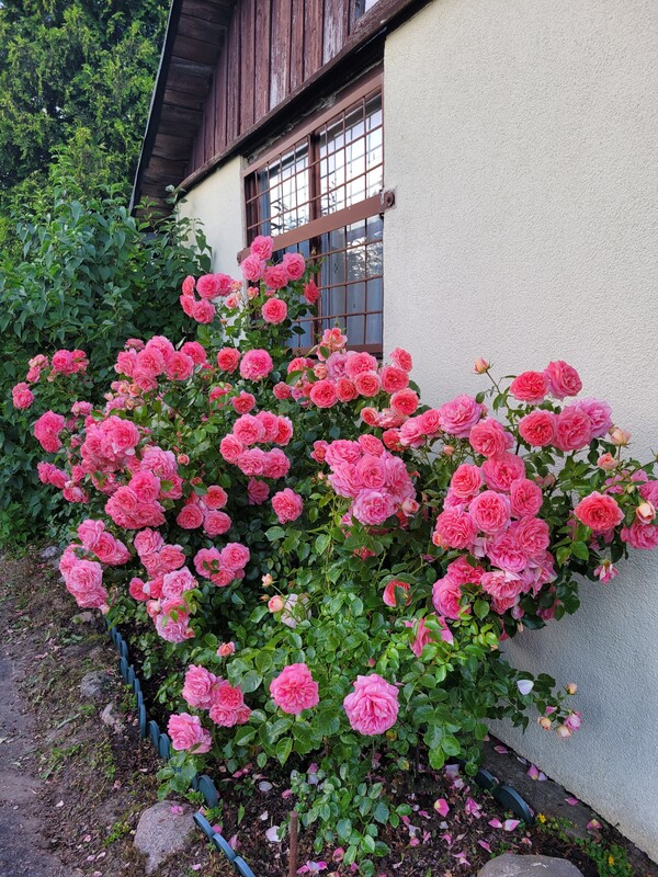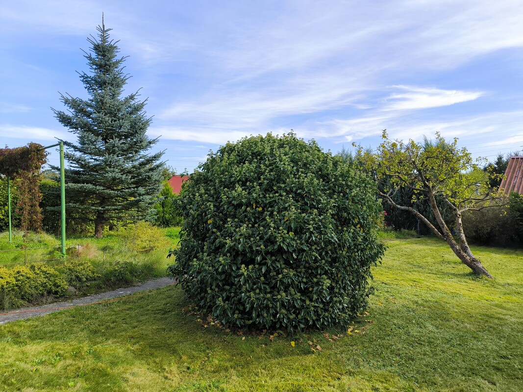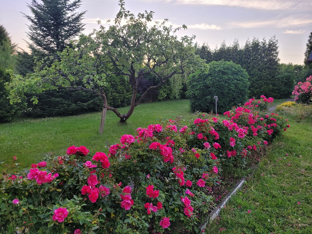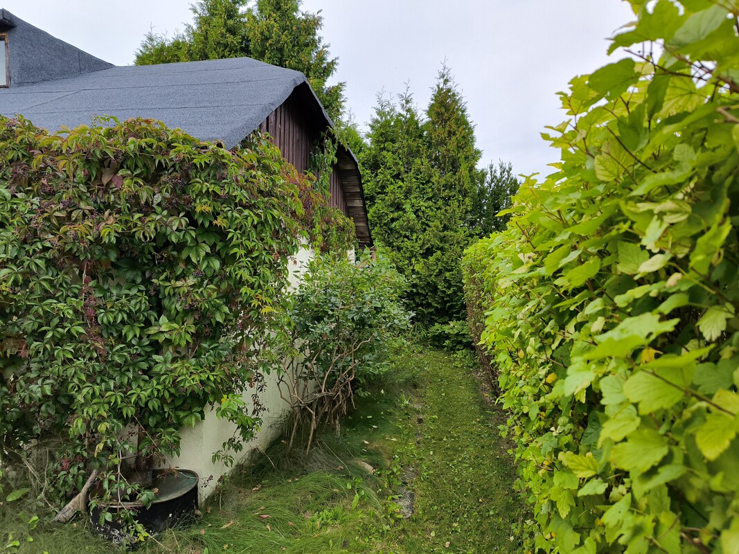 Działka odgrodzona od sąsiadów dużymi nasadzeniami: tujami, jałowcami oraz krzewami ozdobnymi. Za altanką znajdują się trzy krzewy borówki amerykańskiej. Z przodu altanki oraz wzdłuż chodnika znajdują się kilkuletnie długo kwitnące róże.