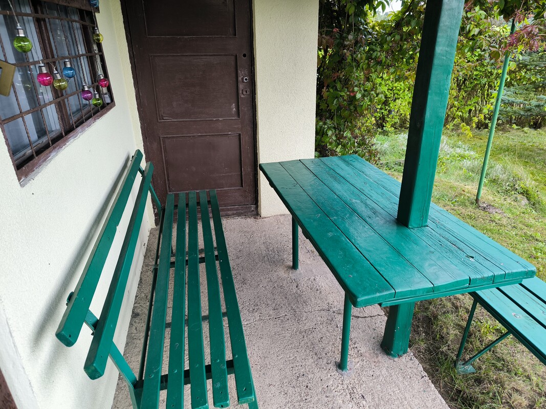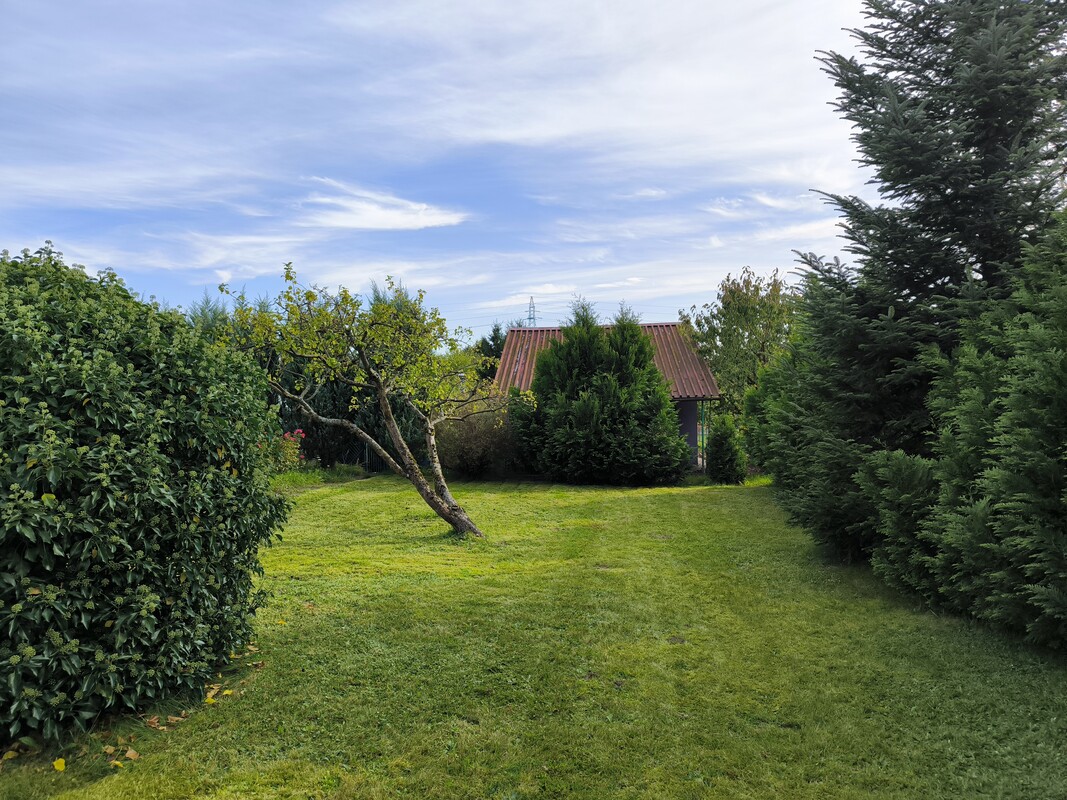 Altanka z trzema pomieszczeniami i poddaszem użytkowym. Osobno z tyłu altanki dostępna jest toaleta. W cenie duża lodówka wraz z zamrażarką, kosiarka elektryczna, taczka.
