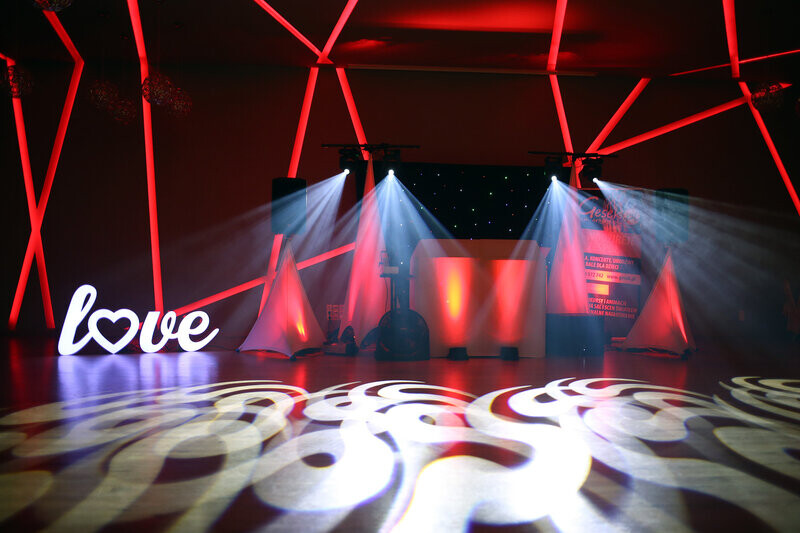 DEKORACJA ŚWIATŁEM - oferujemy dekorację sali weselnej światłami ledowymi w barwach wybranych przez młodą parę. Dekorujemy: ściany, kolumny, filary, stół młodej pary, okna, itp. Posiadamy też NAPIS LOVE i NAPIS 18 na URODZINY.