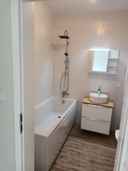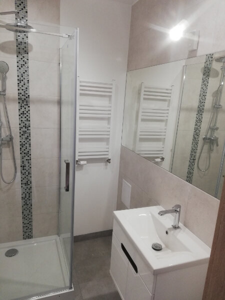 * Łazienka z kabiną prysznicową.