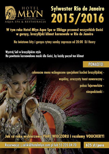 W tym roku Hotel Młyn Aqua Spa przeniesie wszystkich Gości w gorący, brazylijski klimat karnawału w Rio de Janeiro. Na światowe hity i gorące rytmy samby zaprasza od 20 Dj Henry. Wystrój sali w brazylijskim stylu, a na powitanie karnawałowe maski dla Gości, by każdy poczuł ten klimat.