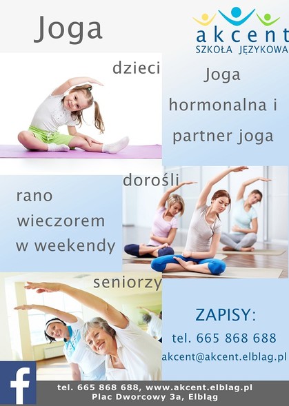 Szkoła Językowa Akcent zaprasza na Tydzień za Free 17-20 września. Uczymy dzieci, młodzież i dorosłych siedmiu języków. Nowość - zajęcia z jogi dla mam z dziećmi oraz joga hormonalna. Odwiedź nas, poleć osobę a otrzymasz 50zł rabatu! Oferujemy najlepsze ceny kursów w Elblągu - już od 12 zł za lekcję!