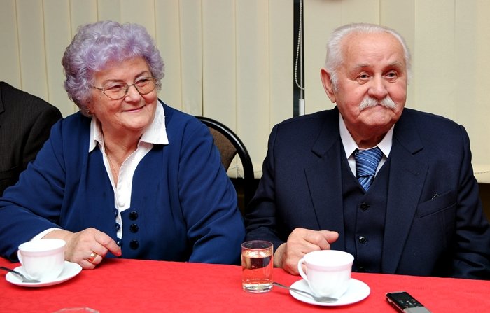 To była wspaniała uroczystość. Seniorzy utworzyli szpaler i trzymając dłoniach srebrne baloniki powitali nowożeńców na sali w SDK „Zakrzewo”. Były kwiaty, życzenia i toasty. A później Państwo Młodzi, czyli Janina i Stanisław Grabowscy oraz ich goście zasiedli do stołu. Pan Stanisław tak wspomina 1951 r., gdy poznał śliczną 17-latkę i zakochał się w niej bez pamięci: - Miałem 20 lat i pracowałem wtedy w sklepie żelaznym na Placu Grunwaldzkim w Elblągu. Moja żona miała wtedy 17 lat i przyszła na remanent. A remanent trwał bardzo długo, bo to był duży sklep. Tam były i gwoździe, i uprzęże, nawet nafta, i farby suche, i olejne. No i Janka wpadła mi w oko. Umówiliśmy się i tak zacząłem chodzić. Później pojechałem do teścia do Rozgartu. Pojechałem tam z jej (Janiny) kuzynem. I to w sumie on zaczął mówić, że przyjechaliśmy oświadczać się. Teść mnie zapytał „Kochasz ją?”. No ja, że oczywiście. Zapytał też żonę, a ona tak nieśmiało powiedziała „Kocham”. Na drugi dzień konia do bryczki zaprzęgliśmy i pojechaliśmy do Urzędu Stanu Cywilnego do Zwierzna. Tam się zapisaliśmy. Teściowa musiała się podpisać, bo Janina miała zaledwie 17 lat. Za kilka dni pojechaliśmy znowu do Zwierzna, do kościoła, by dać na zapowiedzi. Ślub odbył się 30 grudnia 1951 r. A ta miłość trwa do dziś.