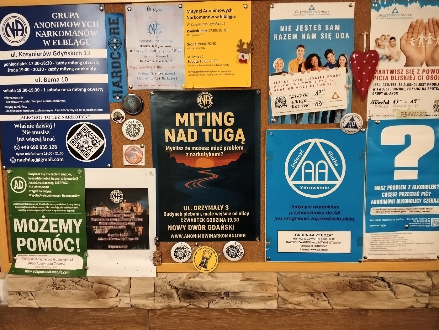 W Elblągu mityngi osób zmagających się z uzależnieniami wszelkiego rodzaju odbywają się w siedzibie Stowarzyszenia Klub Abstynenta "Żuławy" przy ul. Kosynierów Gdyńskich 13. Za zawsze otwartymi drzwiami znajduje się... mieszkanie (a przynajmniej rozkład pomieszczeń na to wskazuje). Centralnym punktem jest duży pokój z ogromnym stołem, otoczonym krzesłami.