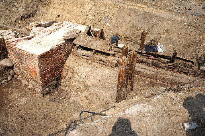 - Elbląg w średniowieczu miał mury obronne, dokładnie dwa pierścienie, które otaczały miasto, ale one znajdowały się po drugiej stronie ulicy – wskazywała młodym słuchaczom. - Ten element tu i ten, który nie wiem tak naprawdę, co przedstawia, są z okresu nowożytnego, czyli zaczęły być budowane w końcu XVI wieku. W ub. r. element obronny, również z tego okresu, odkryliśmy vis a vis poczty. Natomiast widoczna tu konstrukcja drewniana to wodociąg, który przebiegał w stronę dzisiejszej ul. 1 Maja i zaopatrywał w wodę Stare Miasto.