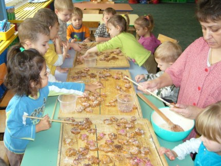 - Ogromnym przeżyciem dla maluchów było założenie fartuszka i czapeczki, dokładne umycie rąk i zajęcie miejsca przed dużą stolnicą - mówi nauczycielka Gabriela Nierońska. - Dzieci musiały uporać się z ogromnym wałkiem, aby rozwałkować kawałek piernikowego ciasta, przygotowanego wcześniej przez panie z kuchni.