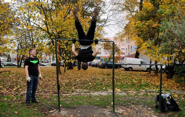 - Patryk „Lisu” Lis: To sport, który polega na dwóch fazach: na podciąganiu się i na robieniu pompek. Reszta to już są różne kombinacje. Chodzi w nim także o to, aby rzucać nałogi, aby trzymać dietę. Albo idzie się na tzw. „melanż”, albo idzie się na trening. Większość osób, które starają się wdrożyć w ten sport walczy ze swoimi nałogami, na przykład z alkoholem. Podobnie jest z papierosami, na początku było tak, że palono jeszcze przed treningiem, ale potem powiedziałem, że tak nie może być. Jeżeli ktoś chce zapalić musi zrobić 50 pompek, tzw. diamond pushups, angażujących tricepsy. Przyniosło to efekty. To jest taka walka, również z samym sobą. Jeżeli ktoś uważa, że musi zapalić to wie również, że musi wtedy zrobić te pompki, a na treningu się nie siedzi tylko ćwiczy, więc ta dodatkowa ilość odstrasza od palenia. Na razie udało się tylko jednej osobie zrobić te dodatkowe pompki (śmiech). Ten sport polega przede wszystkim na rozwoju własnego ciała poprzez jego ciężar, dzięki pompkom, poręczom czy skakance wyrabiamy siłę statyczną. Głównym czynnikiem decydującym o tym, że przychodzą do nas nowe osoby jest chęć poprawienia wyglądu własnego ciała, ale także walka z nałogami. Plusem jest również fakt, że ten sport można trenować za darmo, na świeżym powietrzu.