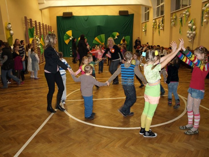 Trwa karnawał, więc najpierw odbyła się wspólna zabawa przy muzyce, którą uatrakcyjnił pokaz tańca nowoczesnego oraz tańca towarzyskiego w wykonaniu absolwentów szkoły oraz uczniów klas III a i III d. Kolejnym punktem programu było zwiedzanie szkoły, pokaz treningu judo w małej sali gimnastycznej, ale największą atrakcją okazały się eksperymenty w gabinecie przyrodniczym oraz zabawy językiem angielskim z wykorzystaniem tablicy interaktywnej. W świetlicy szkolnej dzieci mogły z pomocą nauczycieli wykonać maski karnawałowe.