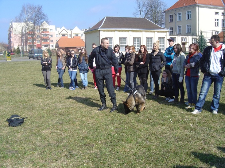 Na koniec zajęć uczniowie zobaczyli pokaz posłuszeństwa psa służbowego Tedi oraz jego praktyczne działanie podczas wykrywania próbek z zapachami materiałów wybuchowych.