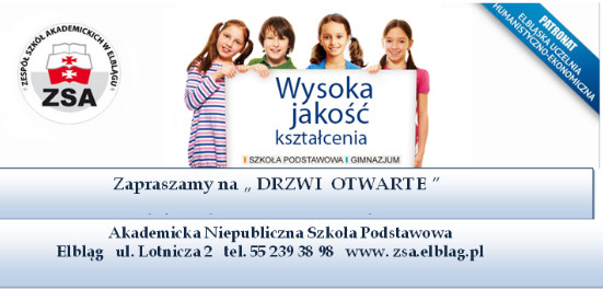W dniu 15 lutego o godz. 17 zapraszamy na „Drzwi otwarte". Rodzice będą mogli zapoznać się z organizacją nauki, opieki i wychowania w Akademickiej Niepublicznej Szkole Podstawowej oraz porozmawiać z nauczycielami i rodzicami naszych uczniów. Zapraszamy wraz z dziećmi, dla których zostaną zorganizowane ciekawe i różnorodne zajęcia.
