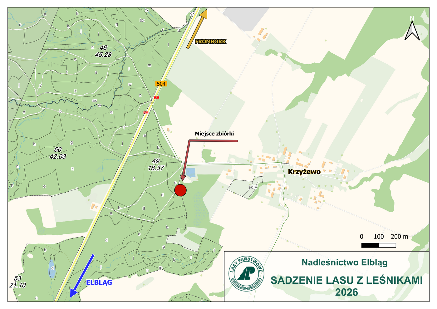 Wszystkich chętnych do wspólnego sadzenia drzew zapraszamy 18 kwietnia 2026 r.na godzinę 10:00 do leśnictwa Pogrodzie. Aby dojechać na miejsce sadzenia drzew należy skręcić z drogi wojewódzkiej nr 504, w stronę wsi Krzyżewo, a następnie zjechać do lasu przy białej kapliczce (pinezka w mapach googla: https://maps.app.goo.gl/Q2t1XJn9ufsueQSW6 ). Obok załączamy mapę dojazdu, a przy drodze będą postawione strzałki z napisem „Sadzenie Lasu”.