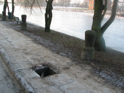 Dzisiaj (14 stycznia) o godzinie 9 pojechałem sprawdzić, czy studzienka na środku chodnika przy Bulwarze Zygmunta Augusta została zakryta. Nie (patrz: zdjęcie u dołu). Przez cały wczorajszy dzień oraz noc mieszkańcom groziło niebezpieczeństwo. Kto prawnie odpowiadałby za ewntualne nieszczęśliwe wypadki?