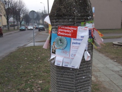 Grudniowe przeganianie się pseudobanków w pożyczeniu kasy na Święta minęło i sądziłem, że skończyło się „afiszowanie” na latarniach. Widać teraz ludzie muszą pożyczyć, by grudniowe pożyczki oddać, bo zupełnie nowe oferty można znaleźć w tych samych zresztą miejscach. Niczym się takie oblepianie nie różni od graffiti, choć może trwałość tych drugich większa. Ale czy ktoś pyta, czy mamy ochotę na tę wątpliwą dekorację?