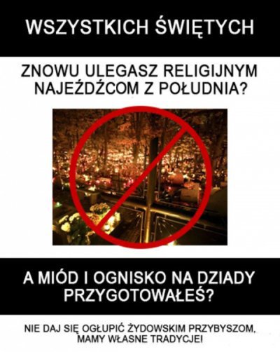 Bo właśnie w tym dniu, odpowiedniku pogańskiego Świeta Dziadów (A. Mickiewicz) powinniśmy modlić się za zmarłych, których dusze mogą przebywać jeszcze w czyśccu, tam gdzie wielu z nas może dotrzeć za różne "wykroczenia", niekoniecznie drogowe... Zwłaszcza, że władza ustanowiła ten dzień wolnym od pracy, być może mając siebie na względzie. Przy okazji jest to święto czczenia męczenników, a takich w Polsce namnożyło się ostatnio tysiące i brak już jest rond i miejsc do ich czczenia. Niemniej wszyscy robią wszystko, aby to święto oddalić od siebie..., bo nikt nie chce umierać, mimo niebiańskiej światłości i niepojętnego szcześcia tam obiecywanego. Mimo mankamentów życia na "polskim padole" . Na tę ofertę załapują się na razie tylko islamistyczni fundamentaliści... A my katolicy co?