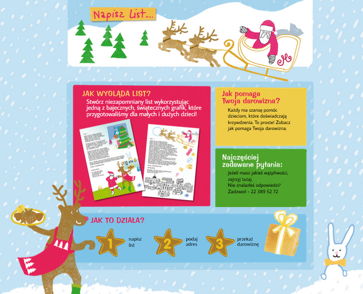 Są trzy wersje listu: do małego, starszego i całkiem już dużego dziecka. Podaj kilka podstawowych informacji o odbiorcy, (tj. imię, wiek, zainteresowania itp.), a Fundacja zadba o resztę.
