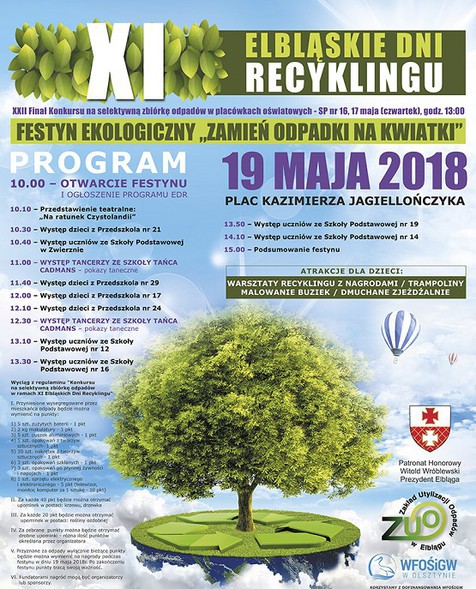 W sobotę, 19 maja na placu Jagiellończyka odbędzie się już XI edycja Elbląskich Dni Recyklingu – ekologiczny festyn dla mieszkańców Elbląga i okolic. Festyn dla mieszkańców odbędzie się 19 maja w godz. 10-15 na placu Jagiellończyka.