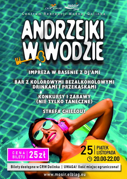 Czas na wesołą zabawę przy muzyce, konkursy z nagrodami oraz wspólne ćwiczenia w rytmie zumby. „Andrzejki w wodzie” powracają do Centrum Rekreacji Wodnej Dolinka, które zamieni się w muzyczną arenę. O dyskotekowy klimat imprezy zadba DJ, a na miejscu pojawi się także bar z przekąskami oraz kolorowymi, bezalkoholowymi drinkami, dlatego prosimy nie zapomnieć o zabraniu karty płatniczej lub gotówki. W przerwach pomiędzy konkursami i zabawami można będzie zaznać relaksu w strefie chillout, która zlokalizowana będzie przy niecce basenu sportowego. Tam znajdą się leżaki i stoliki.